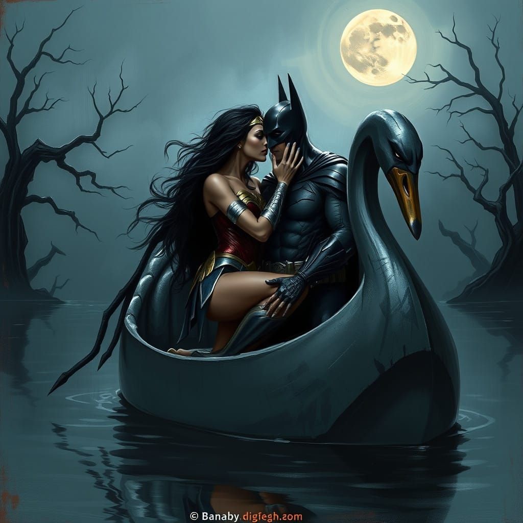 A dramatic and romantic image of Wonder Woman and Batman sharing a tender kiss on a mystical swan boat, surrounded by a dark and eerie atmosphere, with bold brushstrokes and rich textures reminiscent of dark fantasy art.