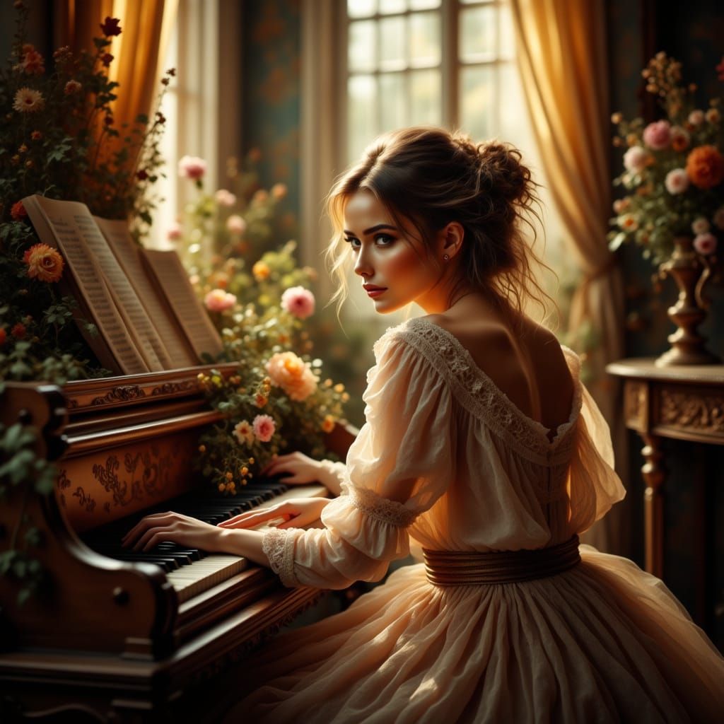 This image shows a woman at a piano in a sunlit room. The aesthetic evokes classic 17th-century portraiture, with soft golden light and warm wood tones.