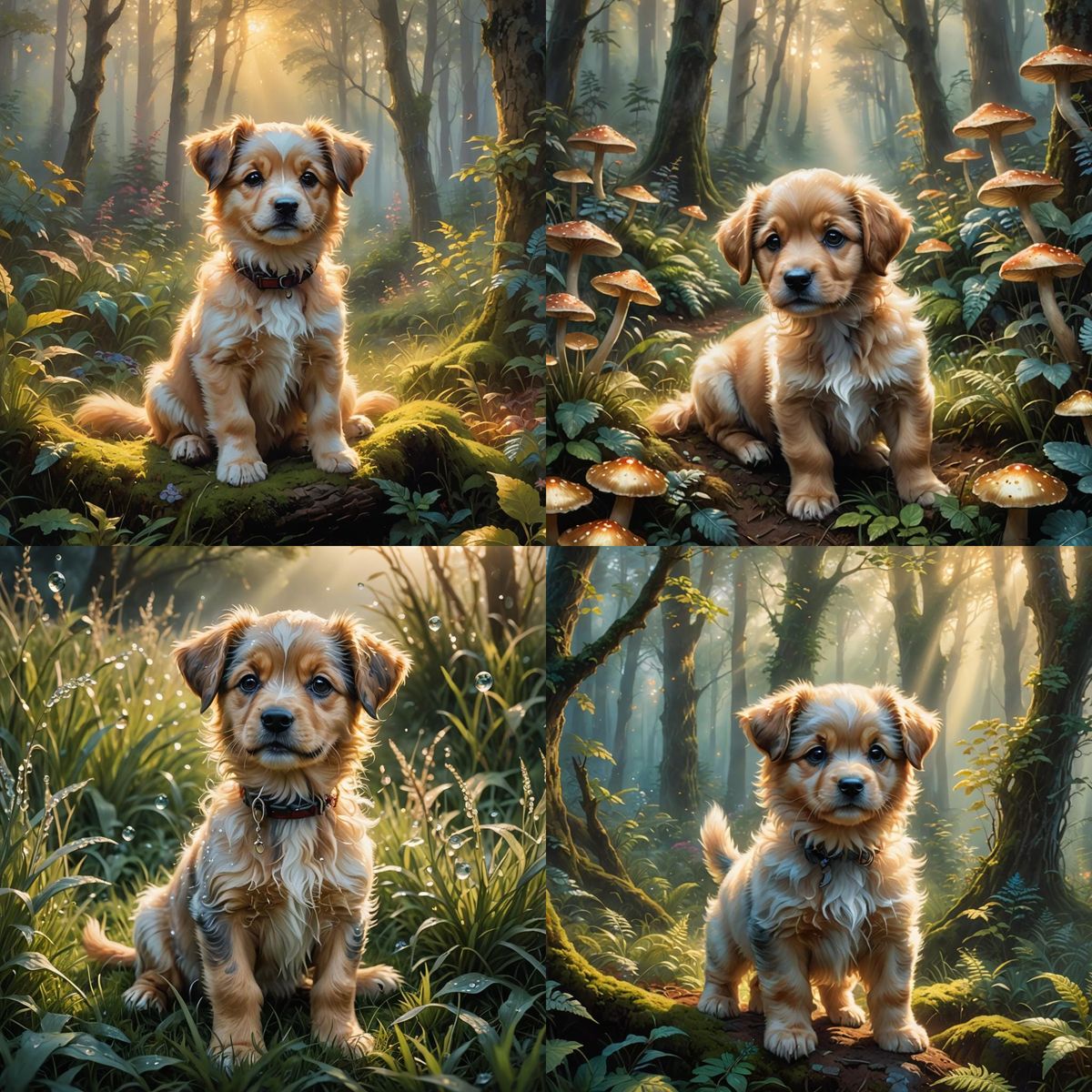 This image shows a cute puppy with bright eyes and a quirky smile. The scene evokes an ethereal, hyperdetailed fantasy style, reminiscent of Thomas Kinkade's work, with a misty atmosphere.