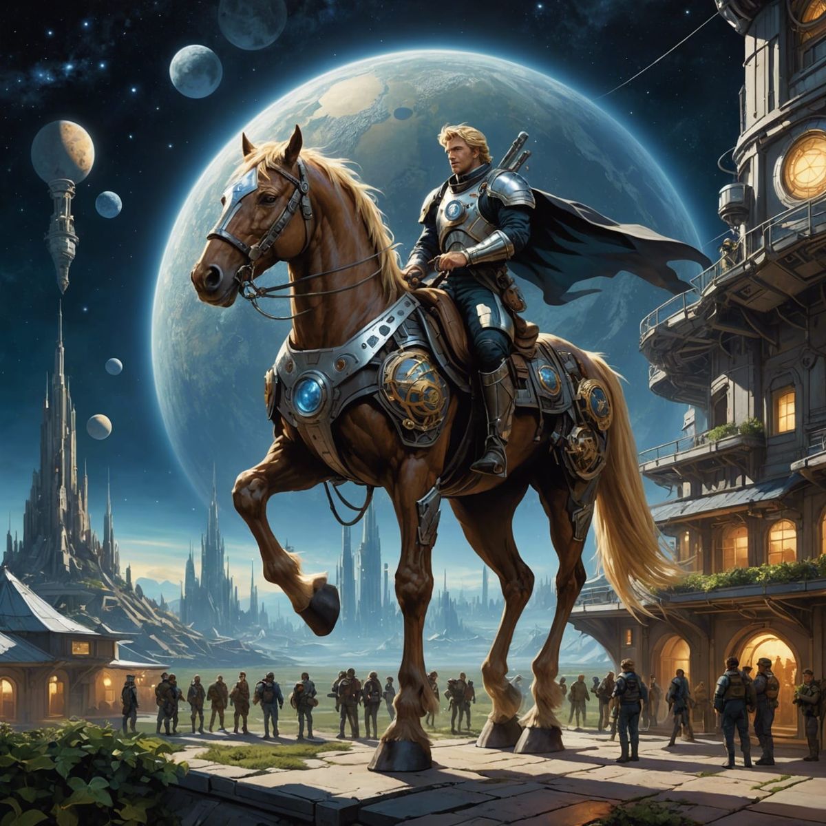 A hyperdetailed concept art image of a blonde man on horseback, coexisting with dragons near a sprawling Texas colony on the moon, with a space station in orbit. This dynamic digital artwork features deep, volumetric lighting.