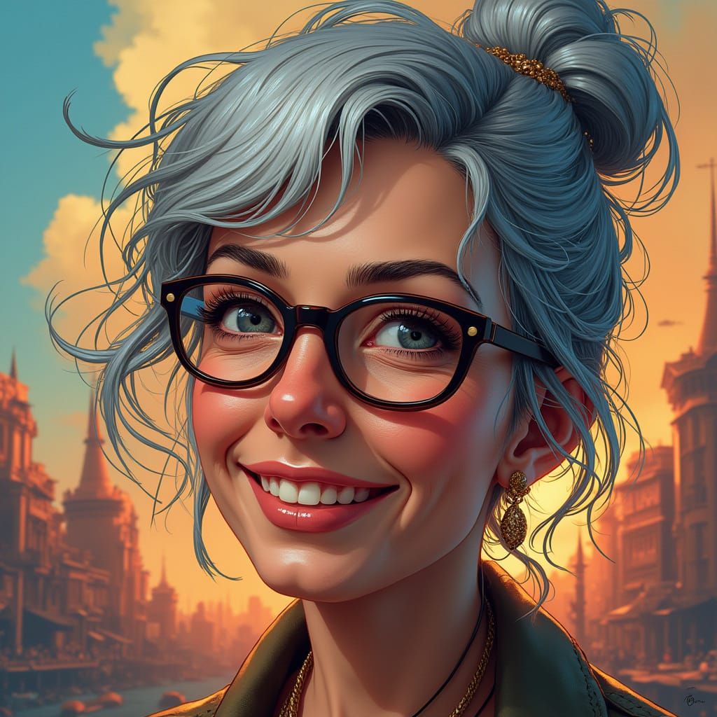 This image shows a warm, smiling woman in her fifties with glasses and graying hair. The background is a detailed matte painting with fantastical elements in a comic book style.