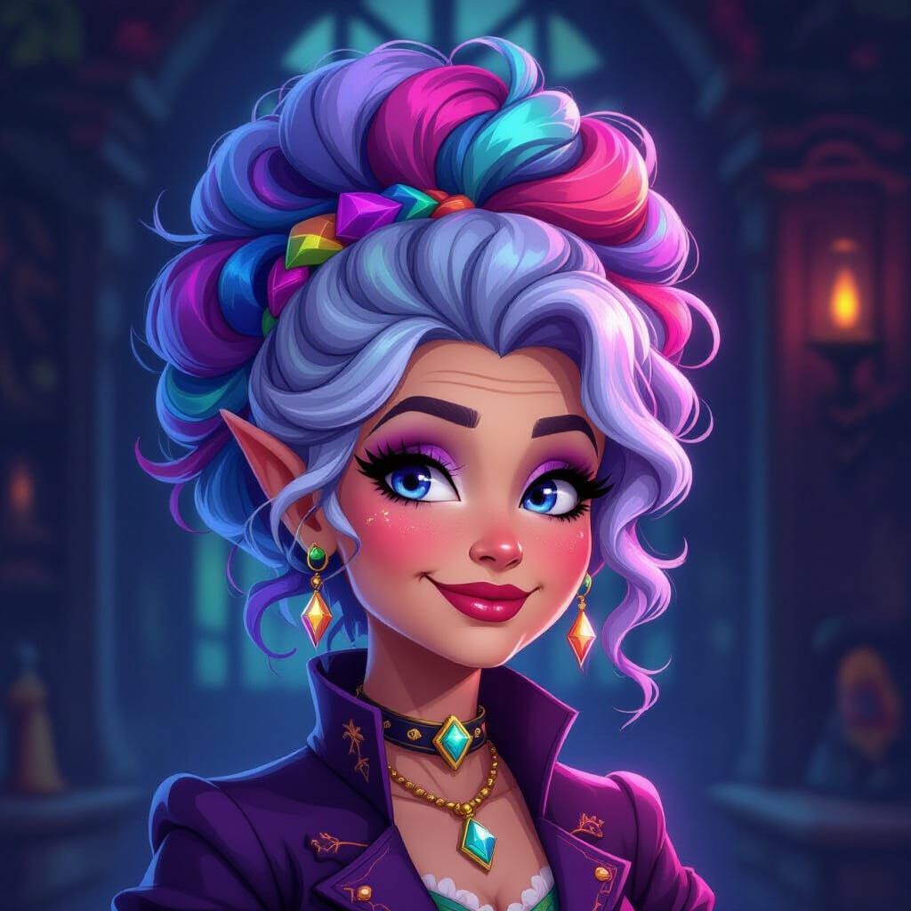 A vibrant Trollz character sports a rainbow updo in a magical shop. The image evokes a cel-shaded manga aesthetic with bold lines, rich colors and subtle textures.