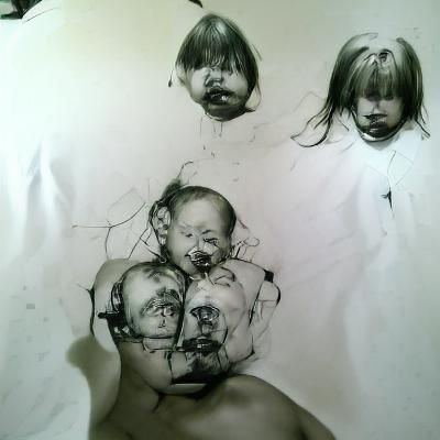 This striking image shows a series of faces rendered in a hyperrealistic ink drawing style. The faces are heavily scribbled over, creating an abstract and unsettling effect.