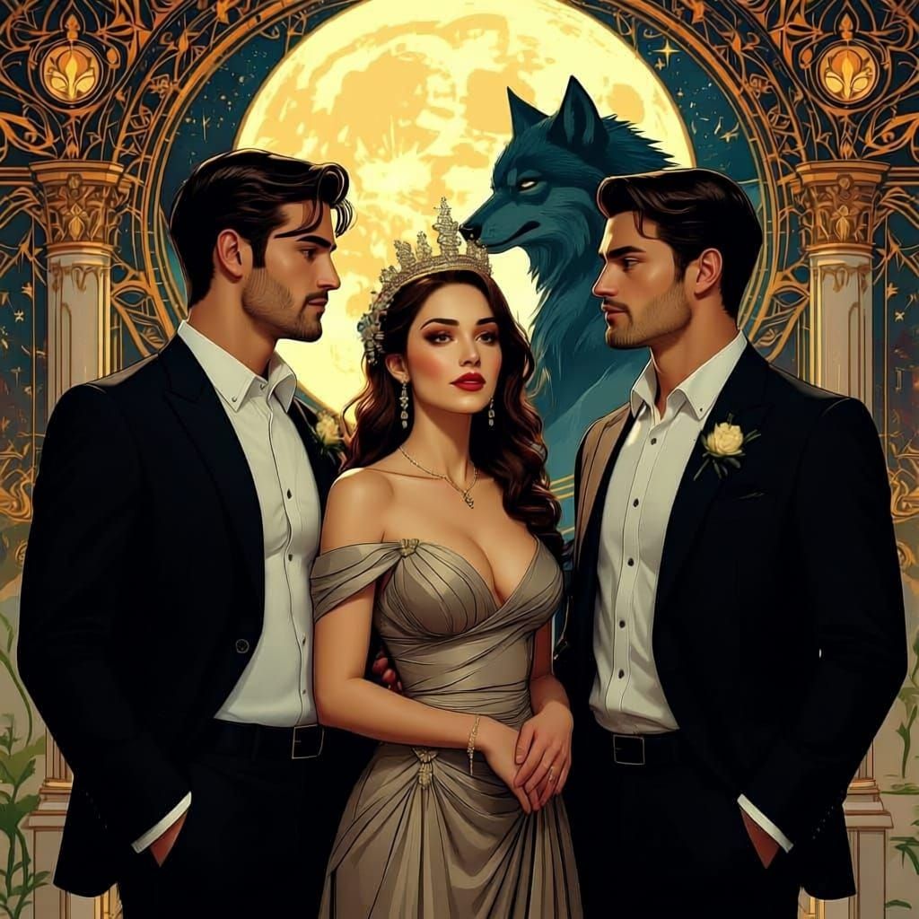 Generate your own love triangle image with werewolves, modern attire, and a moonlit palace setting. It's free and easy!