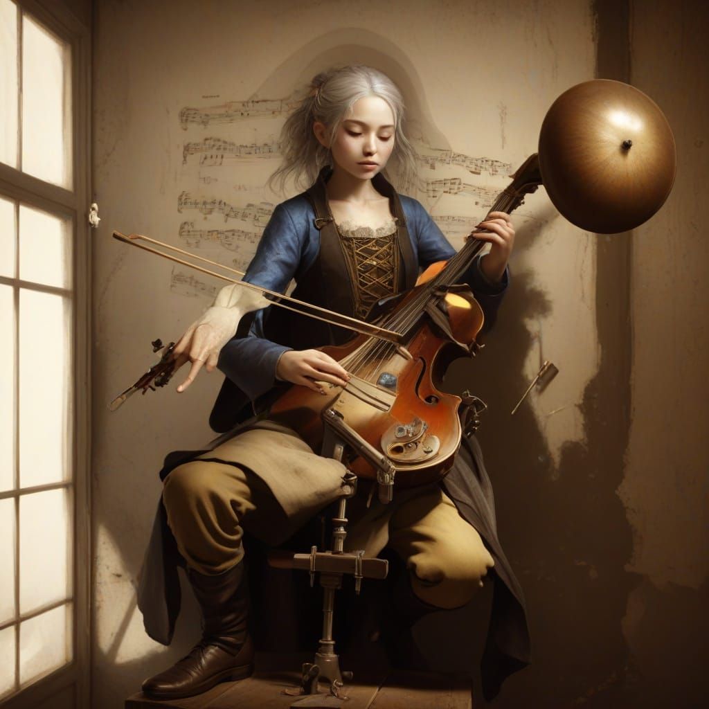 This digital painting showcases a musician with platinum hair playing an instrument, with whimsical creatures and intricate mechanical details. Features dramatic chiaroscuro lighting and high detail.