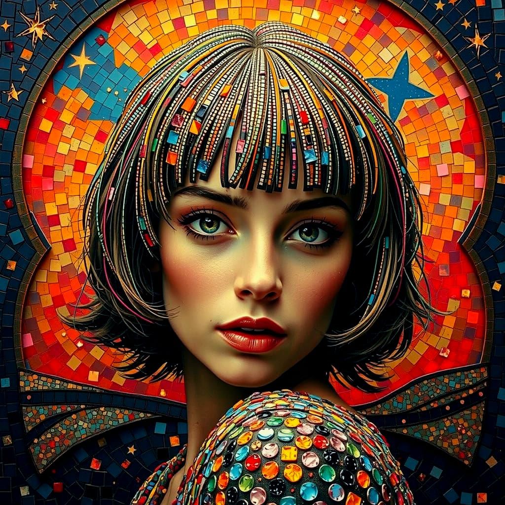 This image shows a photorealistic woman depicted in mosaic style. The vibrant, iridescent colors ripple across her skin, set against a deep starry night sky. The artwork is maximalist with intricate detail.
