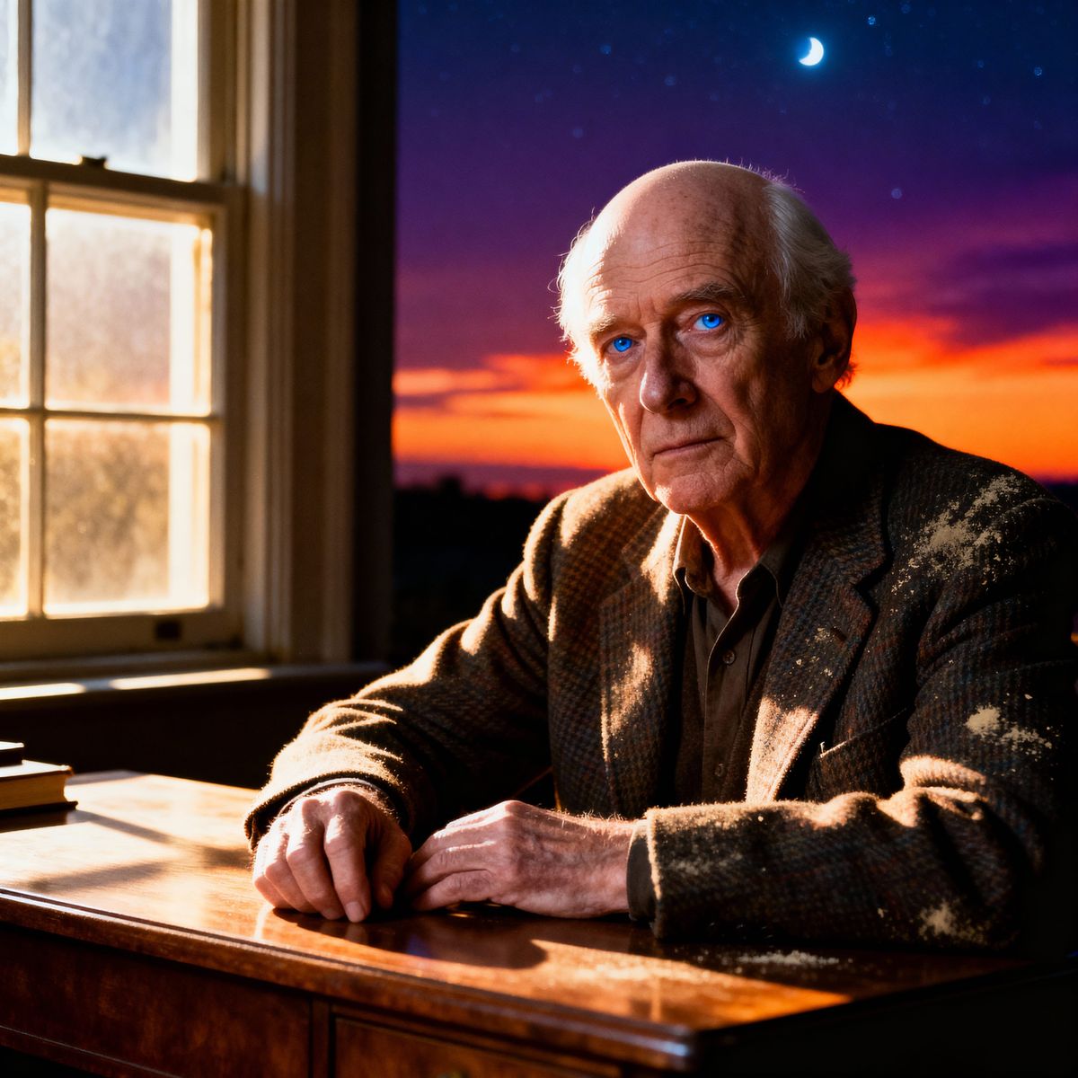 This image shows an elderly novelist at his desk, illuminated by the full cycle of daylight from sunrise to moonlight. The cinematic portrait captures serene endurance and the passage of time.