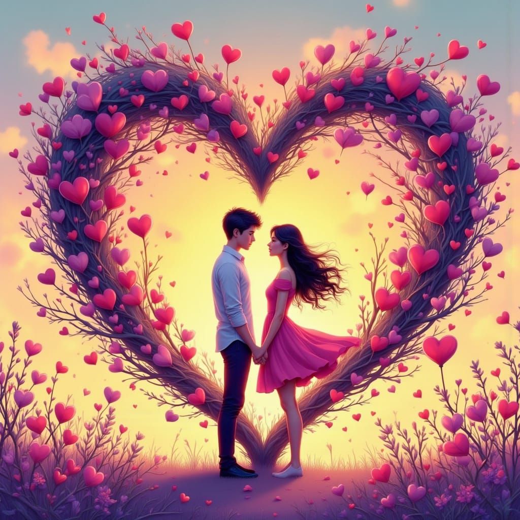 This stylized illustration shows a couple holding hands within a heart of vines. Features a magenta and violet palette with glowing light, in a storybook art style.