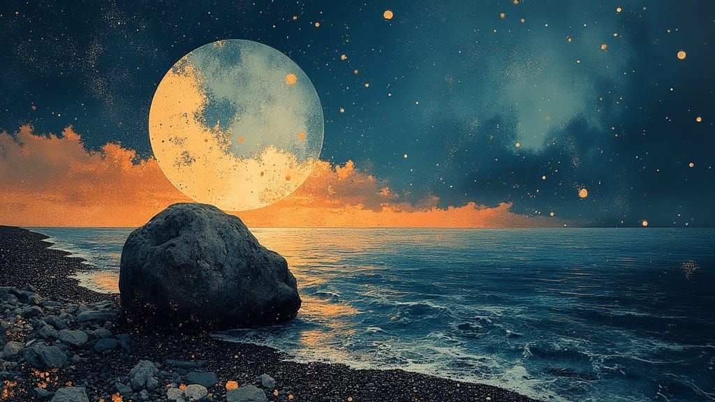 This image captures a serene evening at the Port of Patras under a full moon. A rock is silhouetted against a vibrant sea, blending blues and oranges, in a dark fantasy, cinematic art style.