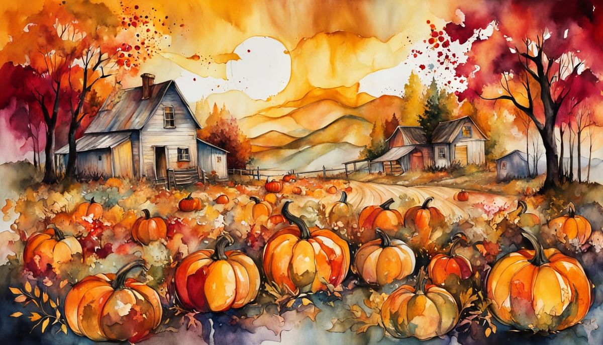 This image depicts a lively autumn pumpkin harvest day at a town patch. It features liminal lighting and a rushed watercolor style with dripping pigments and swirls of ochre and crimson.