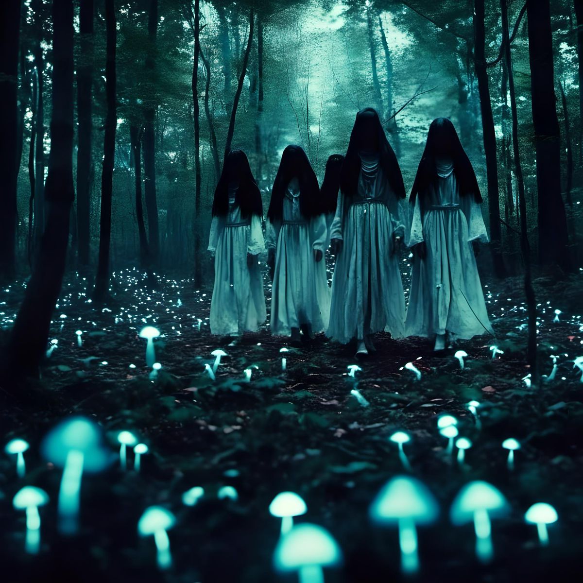 This image depicts four priestesses walking through a forest at night. The scene, reminiscent of a creepy horror movie, features bioluminescent elements and a blurry, dreamlike effect.