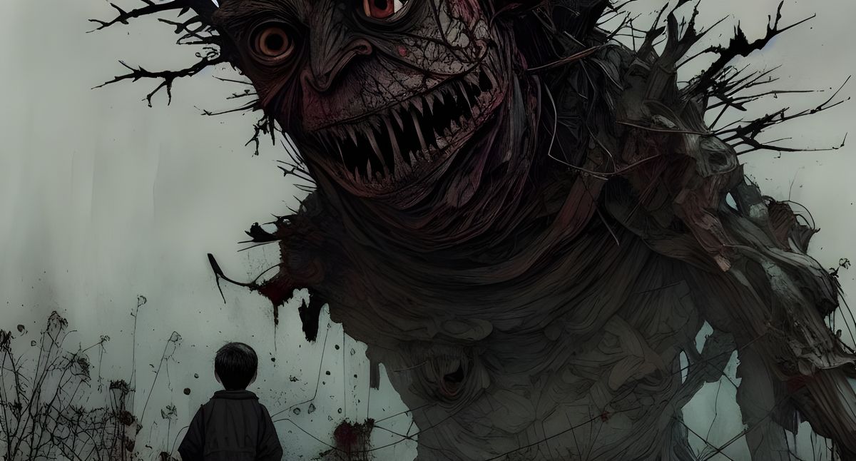 A sinister monster emerges in a dramatic digital illustration. The artwork features watercolor techniques, deep colors, and intricate details, reminiscent of tragic concept art.