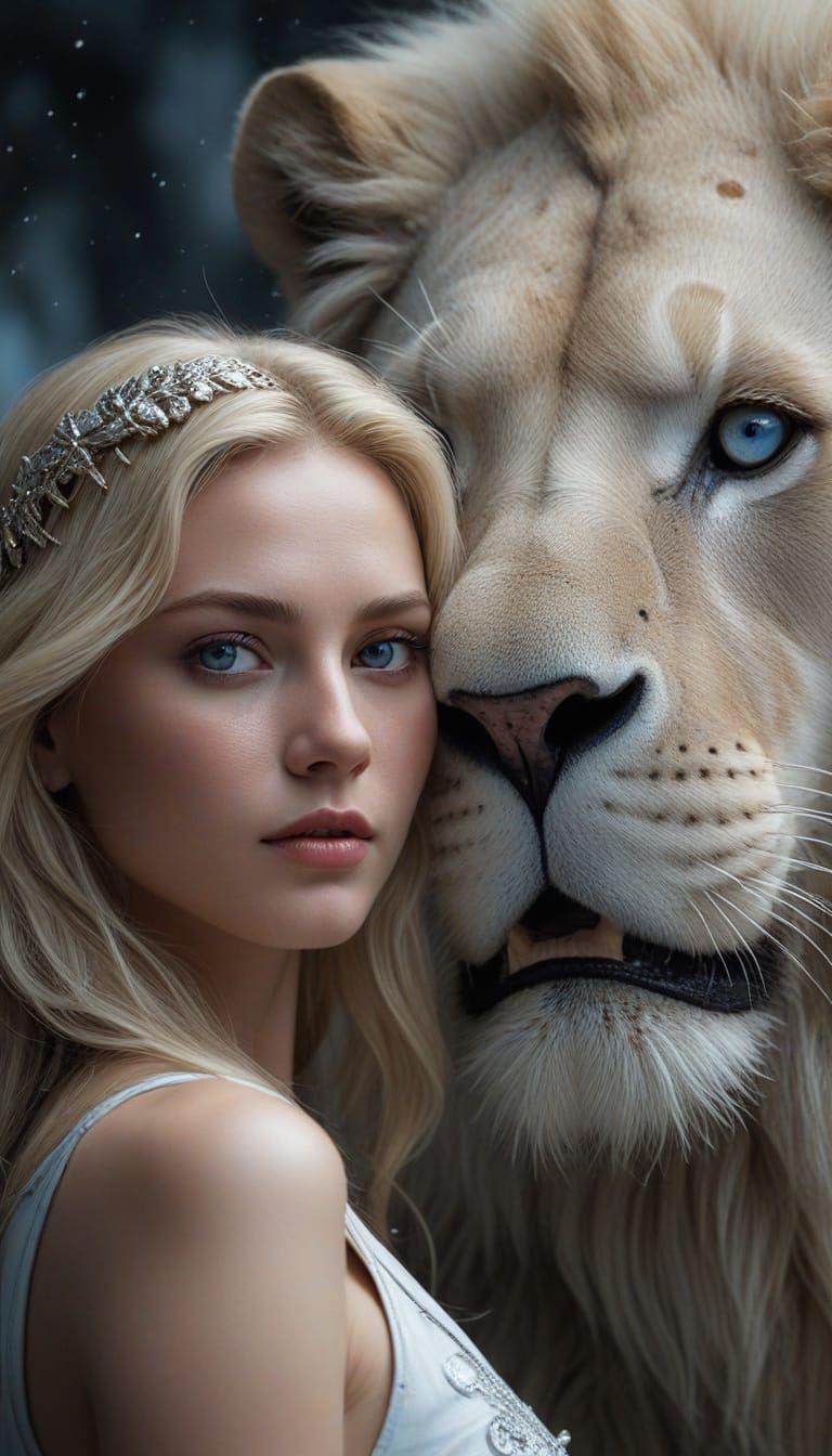 A striking picture of a blonde woman with blue eyes alongside a silver lion. The digital art features ethereal lighting, hyperrealism, and a warm, golden glow.
