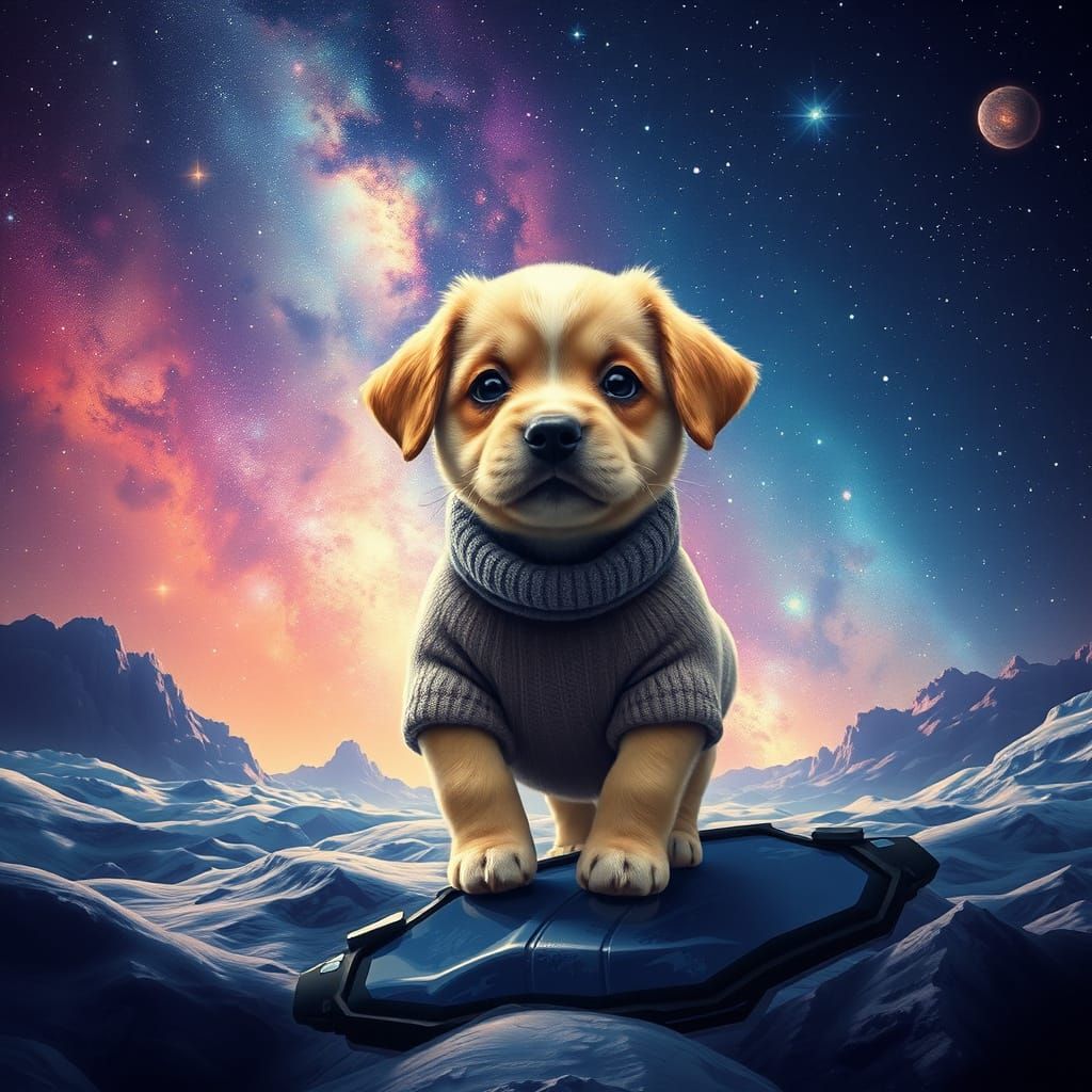 This image shows a baby puppy stepping into a vast, starry galaxy with realistic nebulas and futuristic details, evoking a sense of wonder and adventure in a vibrant, otherworldly landscape.