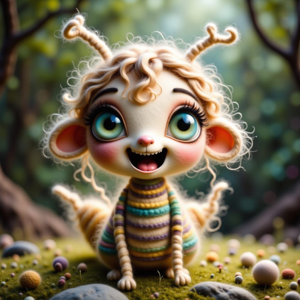This image shows a vibrantly colored, happy caterpillar. The caterpillar appears in a felted wool style, rendered with chibi cuteness.
