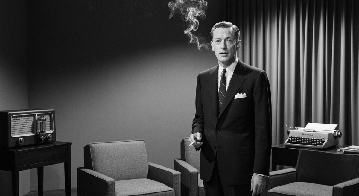 A striking picture of Rod Serling in a black and white film still. The image evokes mid-century cinema, complete with dramatic lighting and vintage props. The scene has a film noir aesthetic.