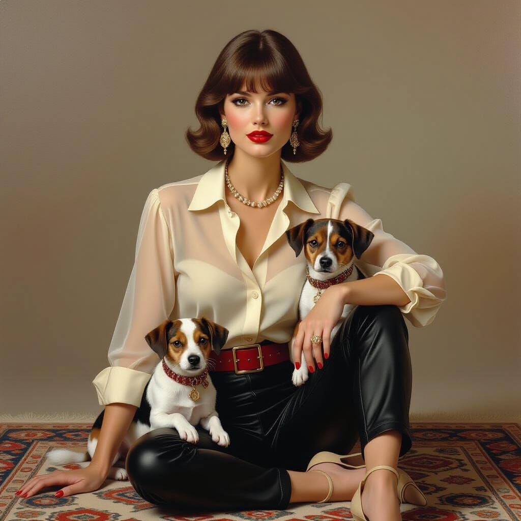 A hyperrealistic image of a woman with short brown hair, red lipstick and elegant earrings. She is wearing a translucent blouse, leather pants and cream heels while holding a small dog.