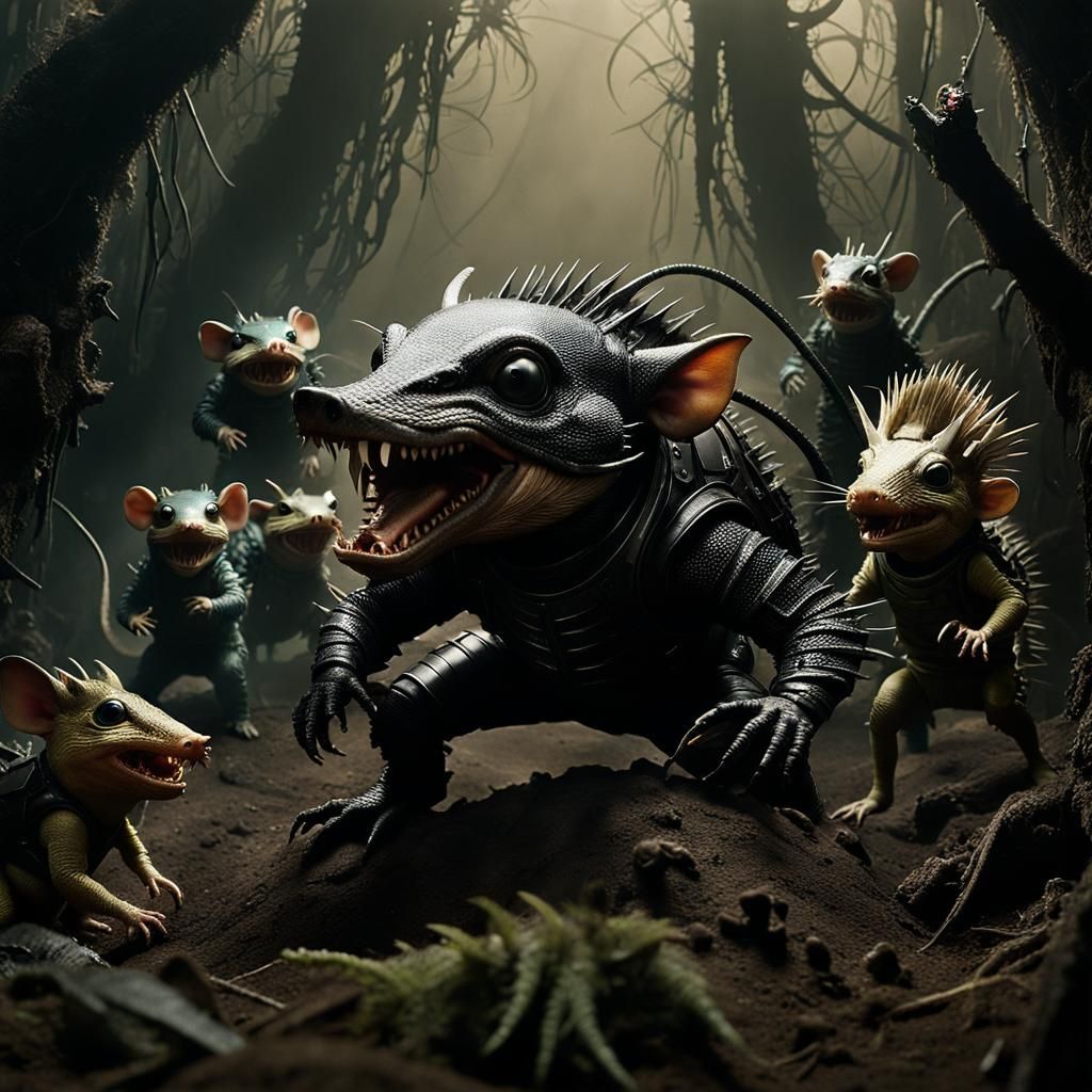 This image shows a bizarre creature being swarmed by rat-like lizards in a strange, post-apocalyptic setting. The scene is rendered with hyperrealism and intricate details, in a surreal fantasy style.