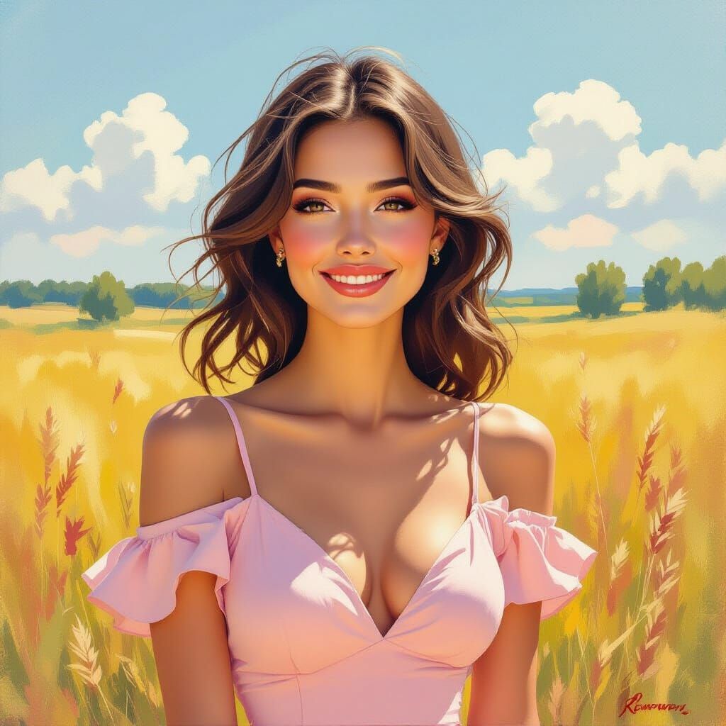 A vibrant oil painting of a smiling Russian woman in a pink dress, standing in a sunlit field. The artwork features bold colors and thick brushstrokes in an impasto style.