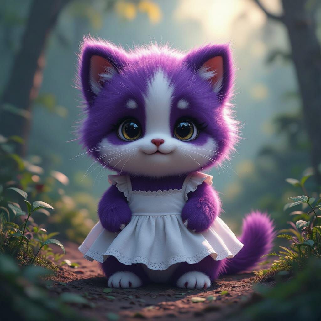 A whimsical creature blending puppy, cat, and panda features with purple fur and a white dress, set in a cinematic environment. The image is a digital matte painting with detailed textures and atmospheric lighting.