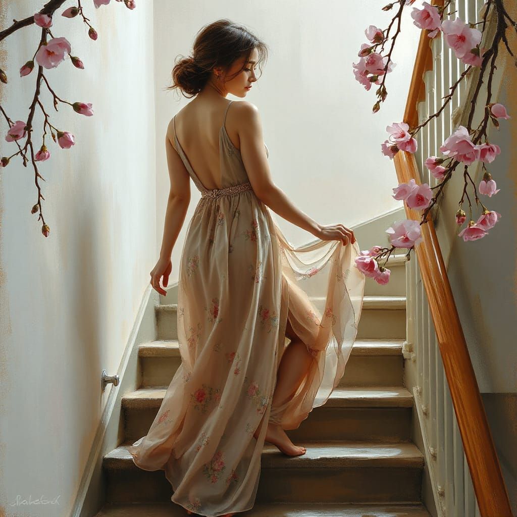 An elegant woman in a floral dress descends a staircase, framed by blossoms. This impressionist oil painting features painterly strokes, soft lighting, and a muted pastel palette with pink and gold.
