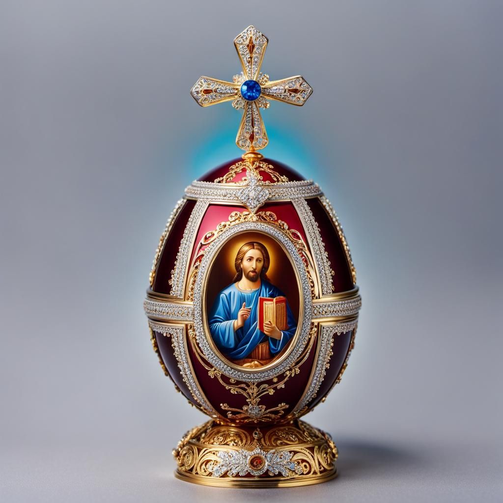 A detailed image of a Fabergé egg, slightly ajar to reveal an icon of Jesus Christ inside. The artwork is highly detailed and intricate.