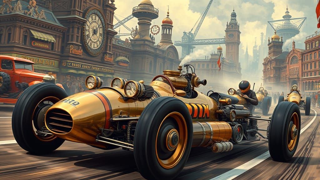 A dynamic scene of Formula 1 racing reimagined with steampunk aesthetics. The image showcases vintage cars with brass and copper details racing through a Victorian cityscape in smooth comic book art.