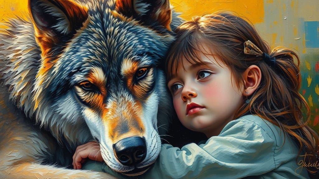 This image depicts a wise wolf resting on a girl's shoulder, her arms around him. Rendered with thick, textured paint in a vibrant, emotional style reminiscent of post-impressionism.