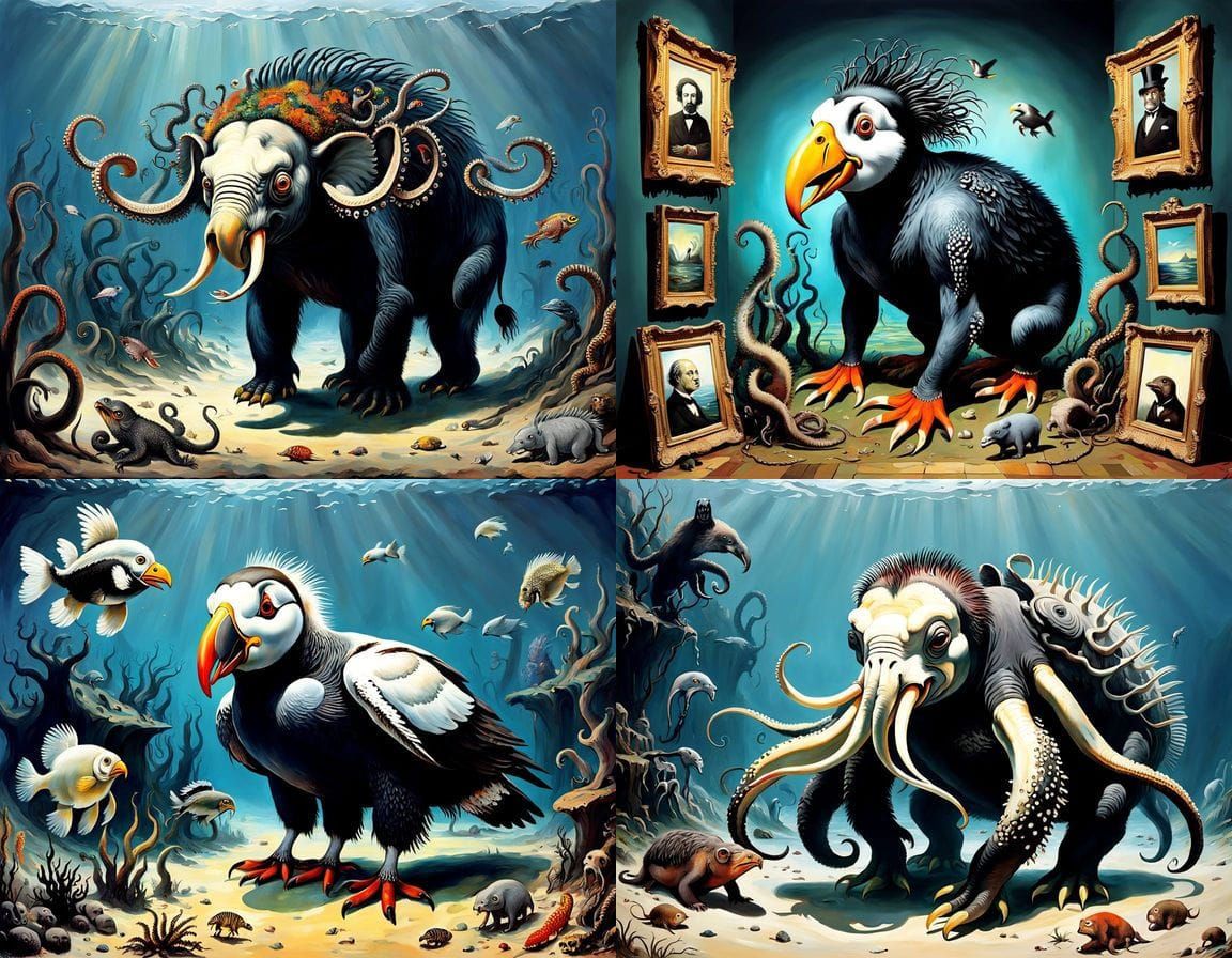 This image depicts a bizarre and grotesque collection of animals and objects in a lush, romantic style. The artwork evokes the styles of Turner, Dali, and Tapies without directly copying them.