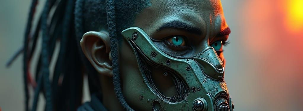 A striking picture of a Treanu alien bounty hunter. The subject has dark olive skin, blue eyes, and cybernetic enhancements, wearing Mandalorian-style armor. Hyper-detailed background with triadic colors and dynamic lighting.