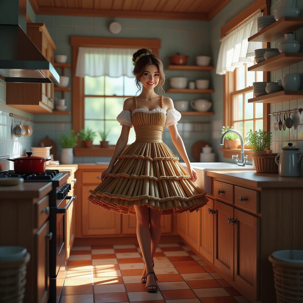 This image shows a young woman in a dress made of sticks, standing in a kitchen constructed from wooden blocks. The artwork features dynamic lighting and intricate details, in a digital art style.