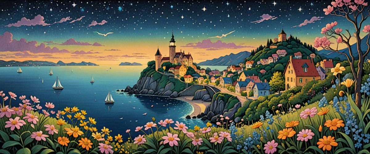 This image shows a naive folk art depiction of a coastal view featuring islands and arched bridges. Rendered in watercolor and gouache, the artwork features pastel colors and volumetric lighting.