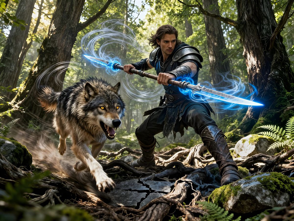 This image shows a fantasy warrior in an agile stance amidst forest roots, wielding dual wind-enhanced staff blades. His wolf companion charges alongside him, illuminated by realistic fantasy lighting.