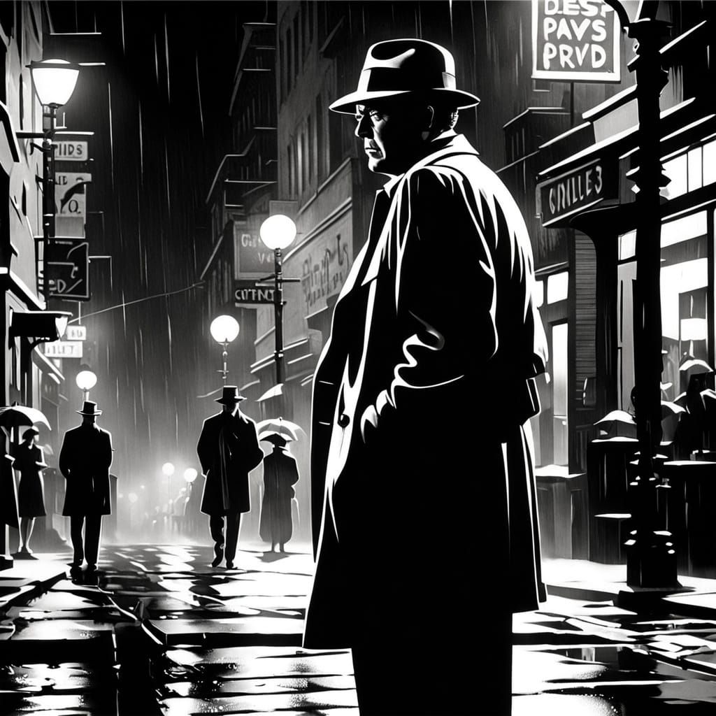 This image shows a lone detective on a rain-slicked street corner, shadows playing across his face. The scene evokes a classic film noir aesthetic with high contrast and gritty, cinematic lighting.