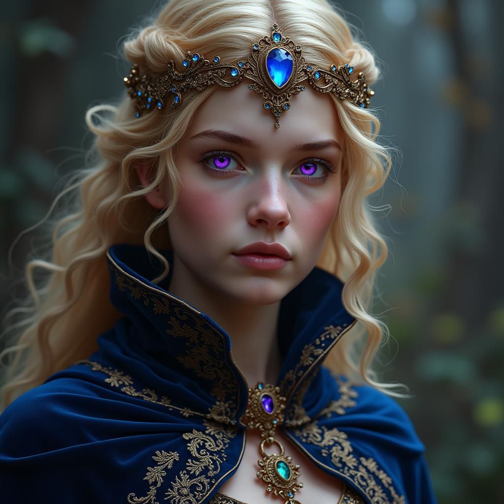 A captivating medium shot of a blonde woman with striking purple eyes. She wears a gemstone circlet and embroidered velvet cloak, set against a mystical fantasy backdrop in a hyper-realistic digital painting style.