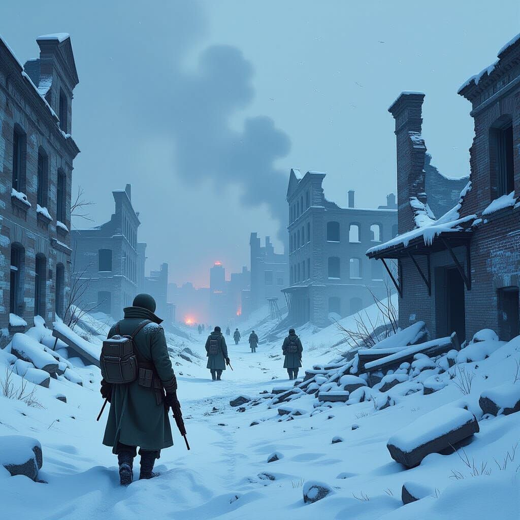 This image shows the snow-covered ruins of Stalingrad, featuring soldiers in worn winter uniforms amidst the destroyed buildings. The scene is rendered in a realistic, gritty, and dystopian style.
