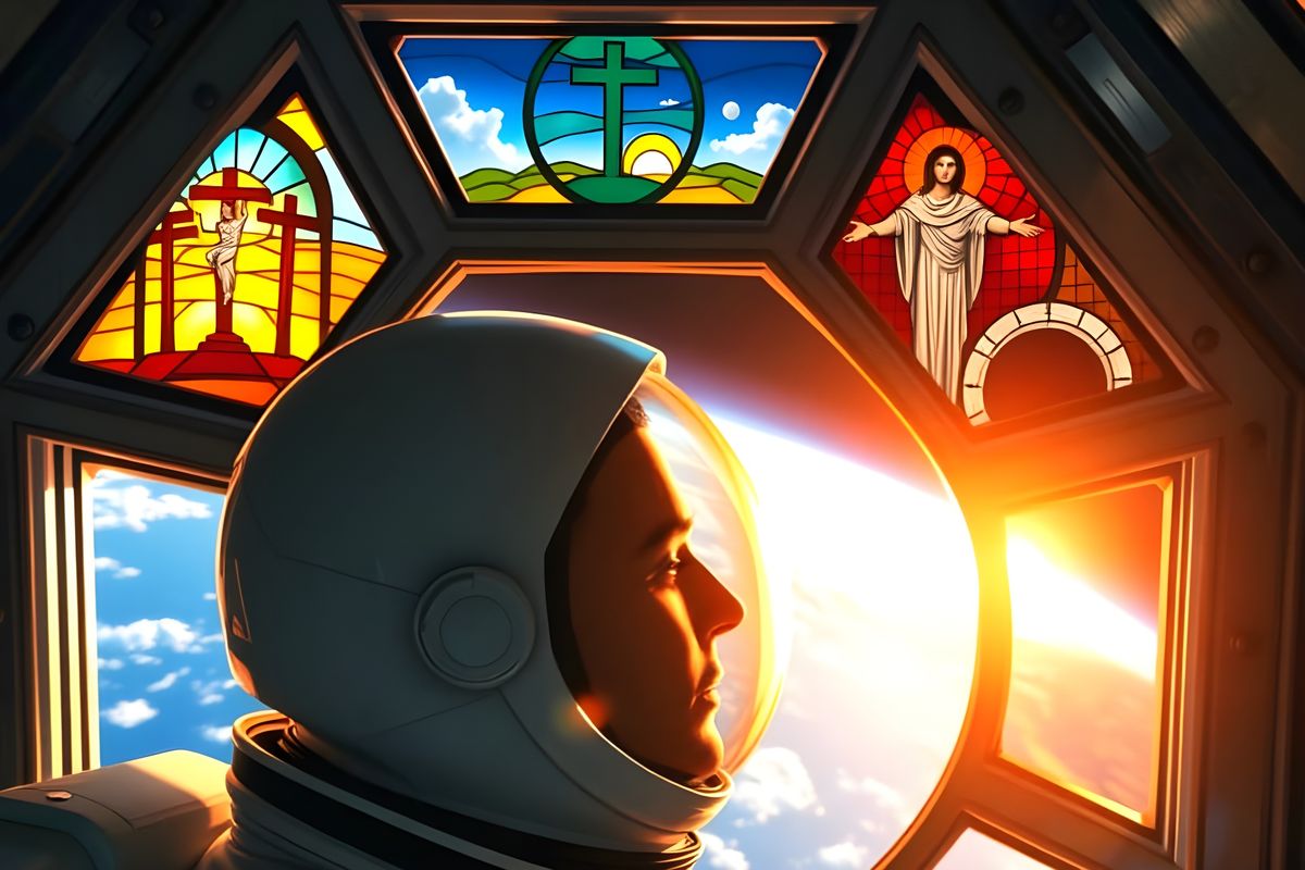 This image shows a stunning stained glass cupola chapel on the International Space Station, with vibrant artwork depicting Christian symbols and a breathtaking view of the curved Earth in the background.