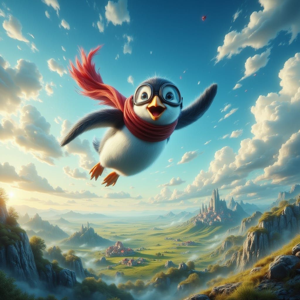 This image shows a penguin man flying for the first time, wearing a red scarf and goggles against a blue sky. A whimsical landscape unfolds below, captured in a vibrant illustration style with warm lighting.