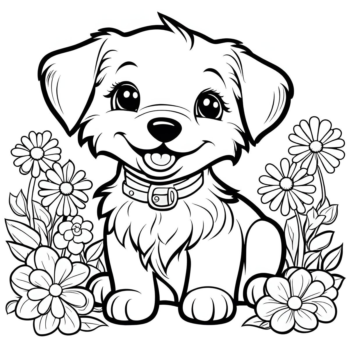 This image shows a cartoon-style puppy surrounded by flowers, rendered as simple black and white line art. The illustration is designed in a coloring book aesthetic.