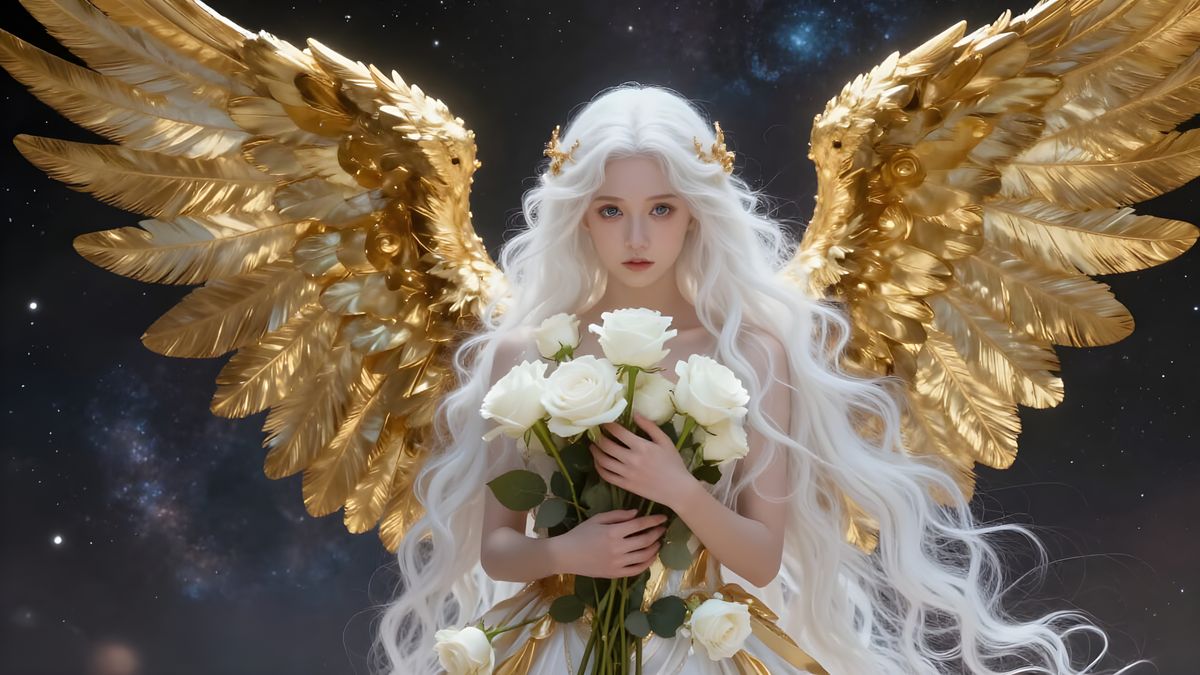 This image depicts a stunningly realistic golden angel with vast wings against a galaxy backdrop. She holds white roses and a flower, embodying victory and whimsical magic.