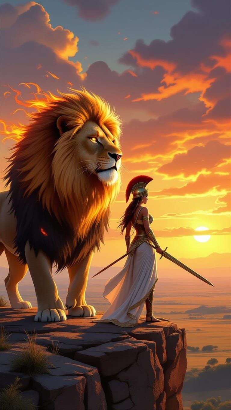 This image shows a female warrior in classical Greek attire standing beside a fire-maned lion on a cliff, overlooking a sunlit savanna. The digital painting features vibrant colors and dynamic lighting reminiscent of trending fantasy art.