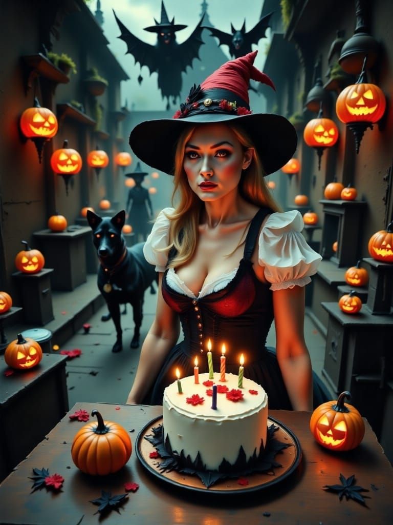 This image captures a festive Halloween birthday party scene featuring a blonde woman in a dirndl, a ghost-shaped cake, and a spooky atmosphere, rendered in a water-ink style.