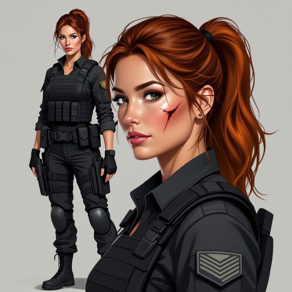 This image shows a photorealistic full-body portrait of a woman in tactical gear. The woman is in her late thirties with auburn hair, and her face features a faded scar. She has a confident stance.