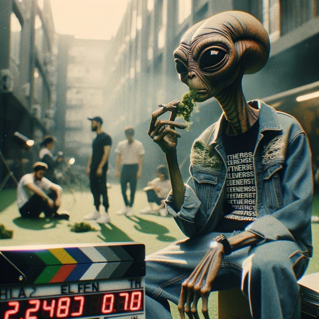 This image captures an atmospheric urban scene with aliens showcasing unique fashion, including t-shirts. The cinematic style features dramatic lighting and a retro film grain for emotional impact.