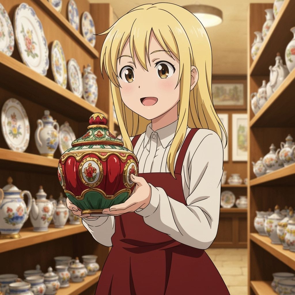 This image captures a happy girl holding a vibrant red, green, and gold Capodimonte ceramic in an Italian shop, rendered in a flat, cel-shaded anime style with cinematic lighting.