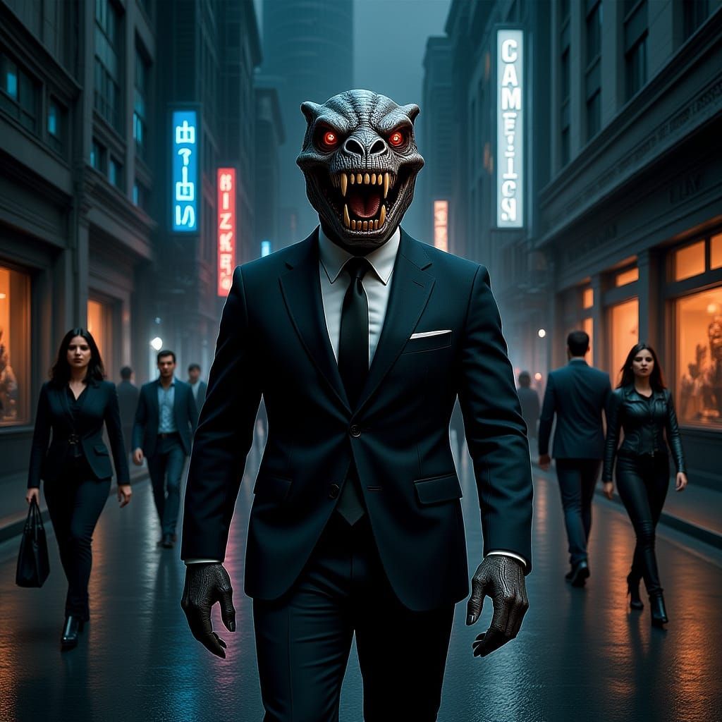 A striking picture of a humanoid dinosaur businessman in a suit walking down a busy city street. The image is rendered in a cyberpunk aesthetic.