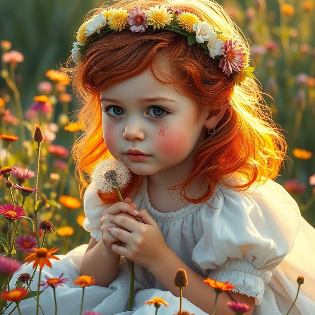 A portrait of a red-haired girl in a flower crown holding a dandelion. Expressive brushstrokes and rich colors create a hyperrealistic, bohemian, and naturalistic image.
