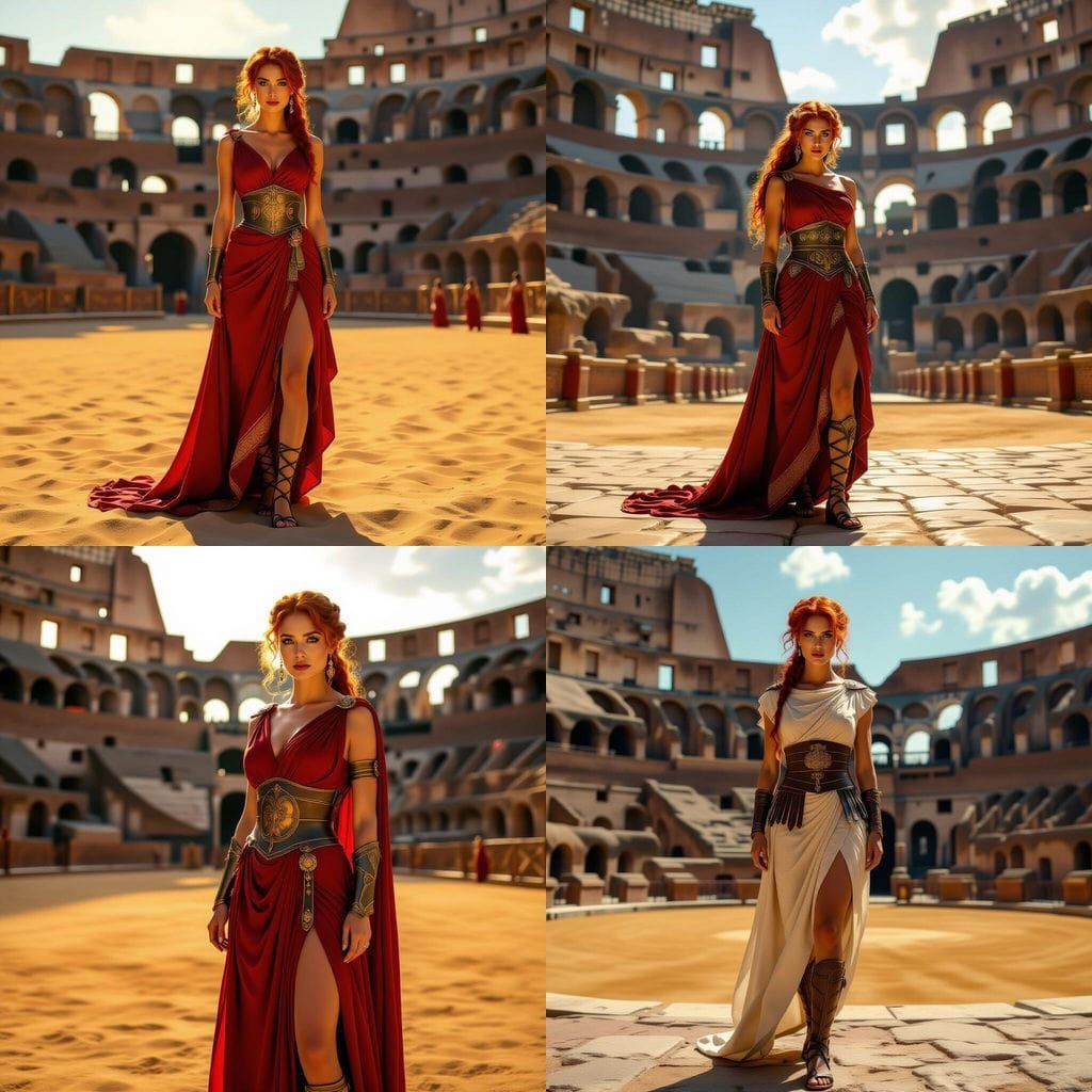 This image shows a red-haired woman with green eyes, dressed in traditional Roman attire and gladiator sandals, standing within the Colosseum arena.