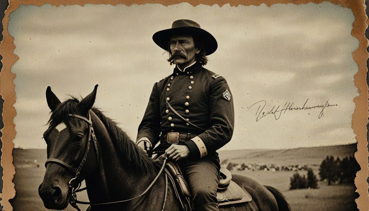 This aged photograph shows General George Armstrong Custer on horseback, looking out at the Battle of Little Big Horn. With a worn, creased texture and faded sepia tone, it evokes a classic early 20th century aesthetic.