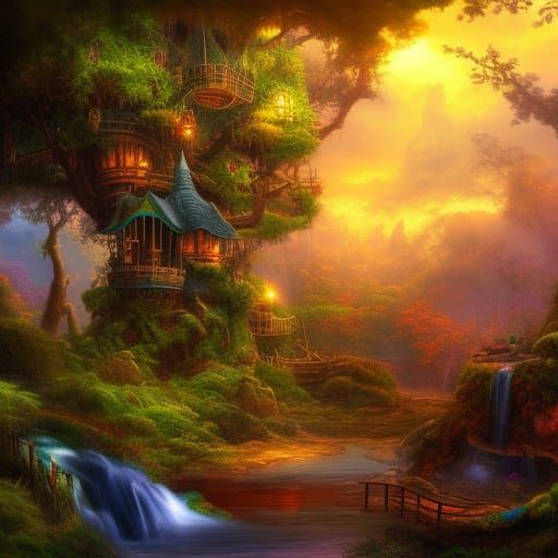A vibrant steampunk treehouse nestled in a lush jungle with sapphire waterfalls under a colorful sunset. This detailed matte painting features complementary colors and intricate details.
